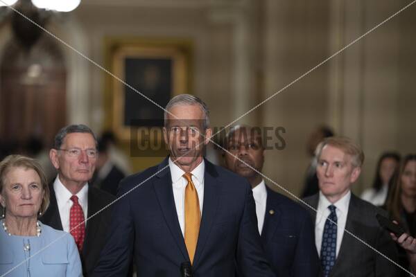 United States Senate Majority Leader John Thune (Republican of South Dakota) speaks to the media after the US Senate Republican weekly luncheon in the Ohio Clock Corridor in the US Capitol in Washington, DC, USA, on Tuesday, October 28, 2025..