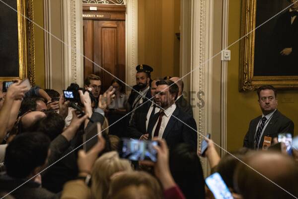 United States Vice President JD Vance departs the US Senate Republican weekly lunch in at US Capitol in Washington, DC, USA, on Tuesday, October 28, 2025. He stopped and talked to the press .